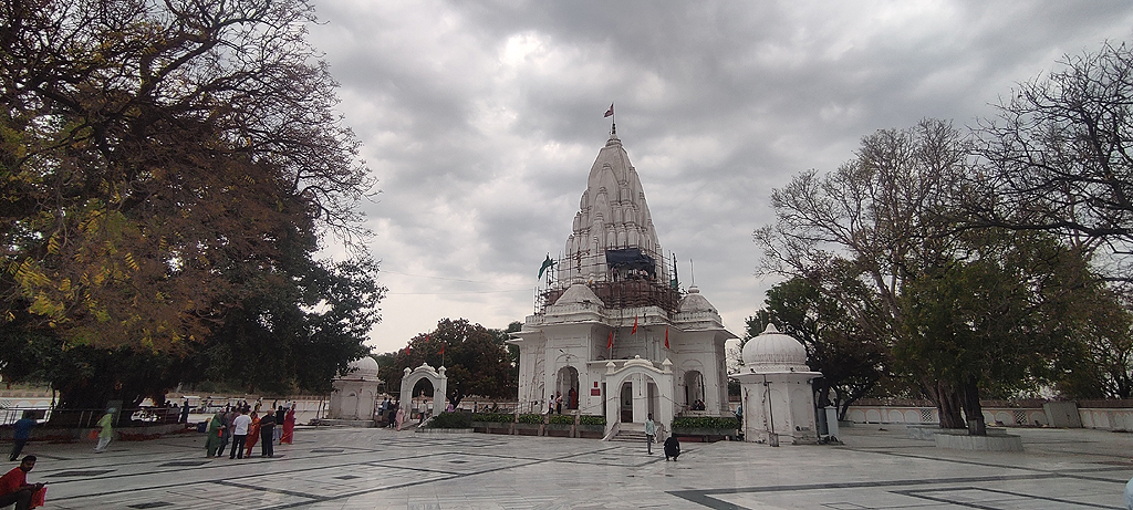 Architecture: Unlike the typical Nagara style of the Himalayas, this temple features a unique blend of Rajput and Mughal architecture, characterized by onion-shaped domes, minarets, and 38 beautiful wall painting panels depicting Puranic themes.